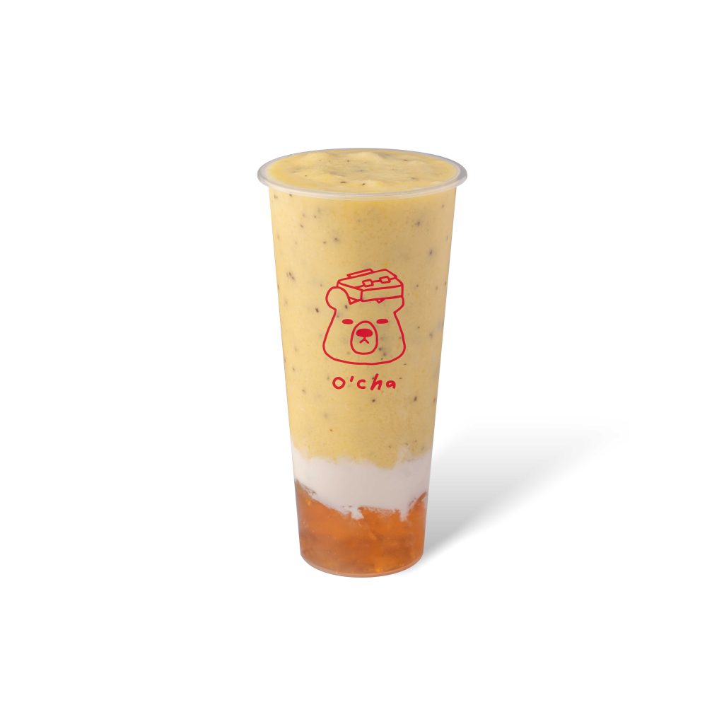A smooth and creamy yogurt drink with bright passion fruit, creating a refreshing sweet and tangy taste.